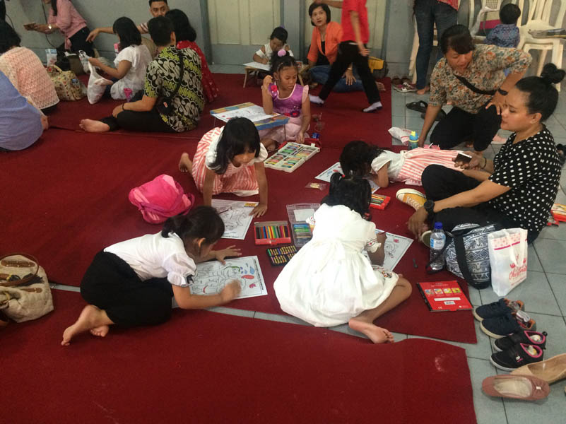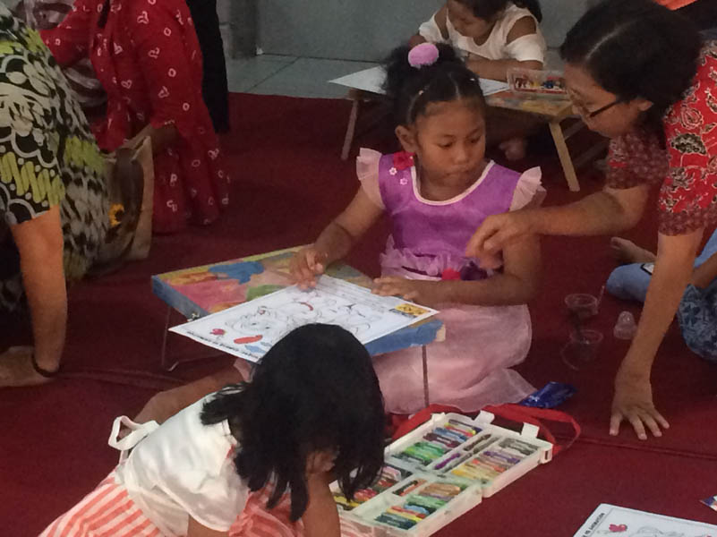Lomba mewarnai diikuti oleh sekitar 15 peserta yang berusia TK A & TK B. Setelah doa bersama, lomba mewarnai dimulai dan terlihat beberapa peserta dengan cekatan menggoreskan warna-warni ke dalam kertas gambar yang telah dibagikan. Senyum dan canda terlihat di wajah para orang tua peserta, sesekali memberikan arahan kepada anaknya agar mewarnai dengan baik.