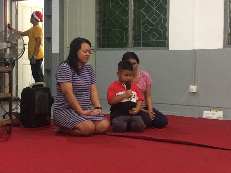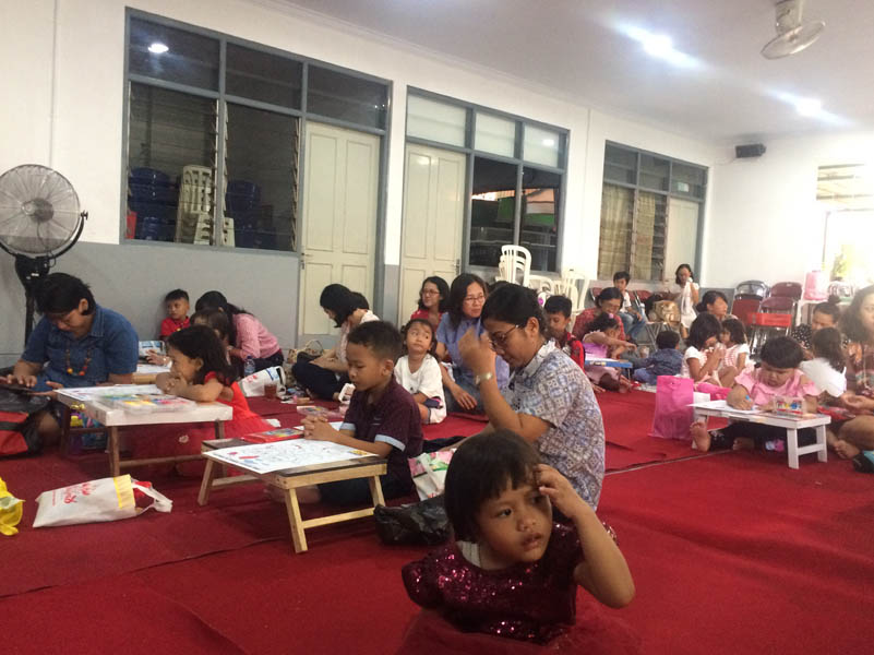 Beberapa anak-anak beserta orang tuanya terlihat sedang bercengkrama dan sesekali bercanda, mereka sedang mempersiapkan diri untuk mengikuti lomba menyanyi dan mewarnai untuk anak-anak yang diadakan seusai perayaan ekaristi Natal Fajar di aula dan gereja.