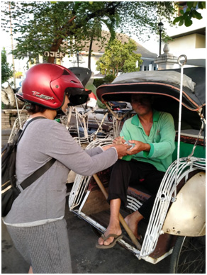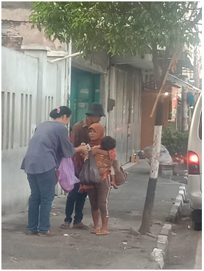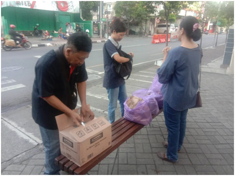 Pembagian nasi bungkus dipelopori oleh Tim APP dan didukung oleh Romo Paroki St. Albertus Agung Jetis, Romo Vincentius Suparman, Pr. Nasi bungkus sejumlah 60 bungkus dibagikan oleh enam orang anggota tim APP, PSE dan Ketua Bidang Pelayanan Kemasyarakatan. Kami berjalan kaki untuk menyapa dan memberikan nasi bungkus, sembari sedikit ngobrol dengan mereka. Karena masih ada sisa beberapa bungkus, kami membagikan dengan naik motor berdua-dua.