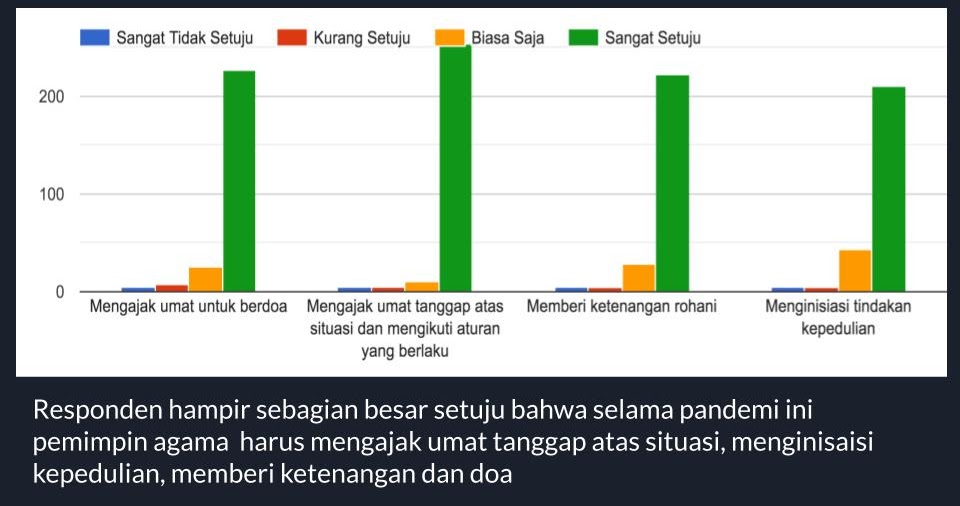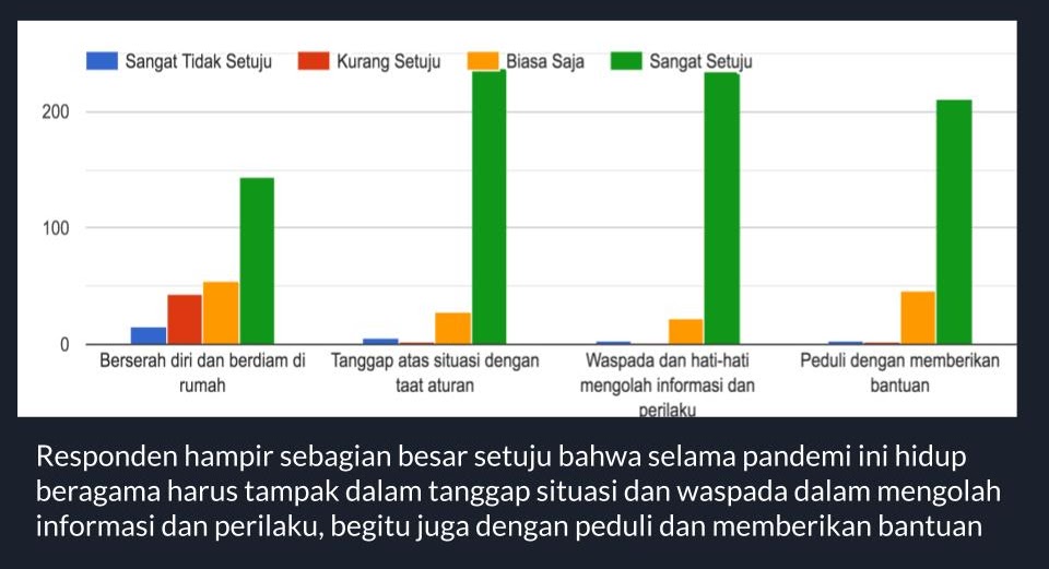 Berdasarkan hasil survey menyangkut tindak iman di masa pandemi ini, terlihat bahwa sebagian besar responden sangat setuju bahwa iman dalam masa tanggap pandemi ini, adalah iman yang berbuat dan tanggap terhadap kondisi.
